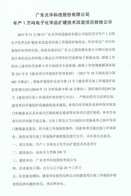 光華科技年產1萬噸電子化學品擴建技術改造項目于2017年11月30日組織了項目竣工環保自主驗收,經過專家組及參會人員的共同評審,同意本項目通過竣工環保驗收,現予以公開。