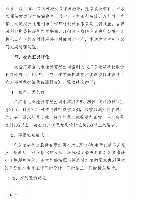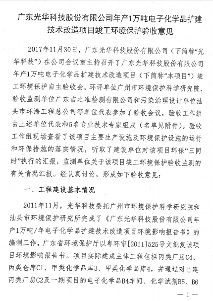 光華科技年產1萬噸電子化學品擴建技改項目通過環保自主驗收