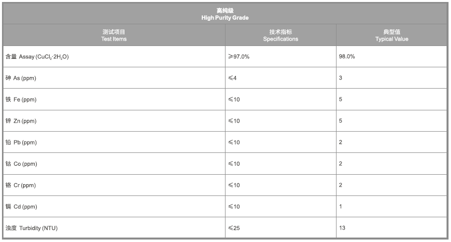 It is mainly used for copper electroplating and electroless copper plating; it is used as mordant, oxidizing agent, wood preservative, food additive and disinfector etc. In addition, it is used for deodorization and desulfuration of petroleum fraction, metal refining and photography; it is also used as chlorination reagent, oxidation reagent and Lewis acid regent.