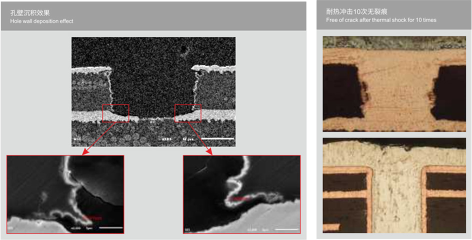 TS-ECuSet系列是應用于水平線的中低溫化學沉銅,堿性離子鈀活化體系,能夠快速再樹脂和玻纖構成的孔壁上進行均勻、致密且穩定的化學沉銅層。
